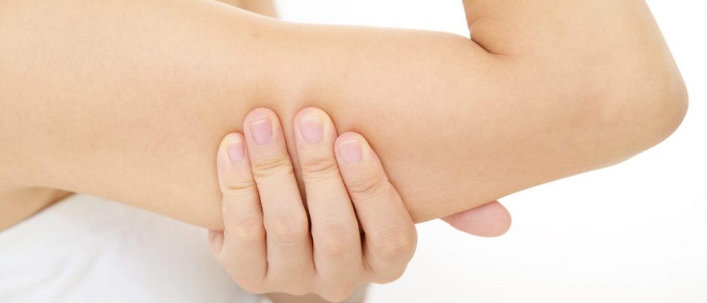 この状態では、上腕三頭筋という、二の腕の後ろ側にある筋肉が引き伸ばされて、外側の筋肉が押し出されます。