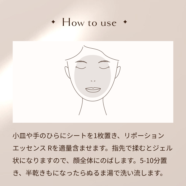 溶かして使用する、フリーズドライのシートタイプ 無香料 小皿や手のひらにシートを1枚置き、リポーションエッセンスを適量含ませます。 指先で軽く揉むとジェル状になりますので、そのまま顔全体にやさしくのばしてください。 5〜10分ほどおき、半乾きになったらぬるま湯でやさしく洗い流します。 週に1〜2回のスペシャルケアとして、普段のお手入れにプラスするのがおすすめです。 擦る必要はなく、やさしくなじませるだけで十分な効果を感じていただけます。 ・お肌に異常が生じていないかよく注意して使用してください。 ・傷やはれもの、湿疹等の異常がある部位にはご使用をお控えください。 ・使用中または使用後に赤み、はれ、かゆみ、刺激等の異常があらわれた場合は、使用を中止し、皮膚科専門医等へご相談ください。 ・目に入らないようご注意ください。万一目に入った場合は、すぐに水またはぬるま湯で洗い流してください。 ・乳幼児の手の届かない場所に保管してください。 ・極端に高温または低温、多湿、直射日光のあたる場所には保管しないでください。 ① フリーズドライ製法 × 防腐剤フリー ② やさしく角質&毛穴ケア ③ 贅沢美容成分で明るい素肌へ 「小さいけれど本当にスッキリする」 ーそんなリピートの声が多数寄せられています。 普段のケアでは物足りないと感じるときのスペシャルケアや、肌をリセットしたい時、気分転換にもぴったりな一品です。商品の形状