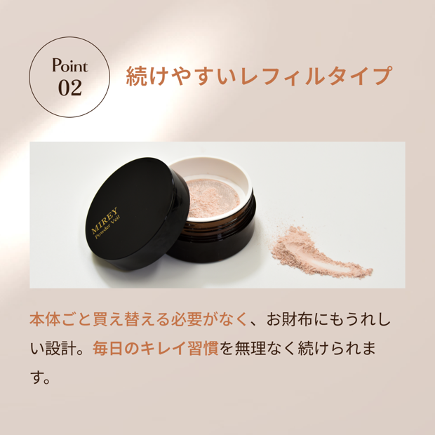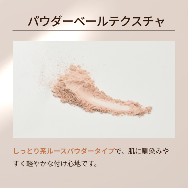 しっとり系ルースパウダータイプ 無香料 パウダーベール専用ケースの内蓋を開け、レフィルの粉をケースに移し替えてご使用ください。 使い方は通常のパウダーと同じで、パフに適量をとり軽くなじませ、額・頬・あごに点置きした後、顔全体にくるくると磨くようにのばしてください。 ※本品には高級パフやケースは付属しておりません。 ・お肌に異常が生じていないかよく注意して使用してください。 ・傷やはれもの、湿疹等の異常がある部位にはご使用をお控えください。 ・使用中または使用後に赤み、はれ、かゆみ、刺激等の異常があらわれた場合は、使用を中止し、皮膚科専門医等へご相談ください。 ・目に入らないようご注意ください。万一目に入った場合は、すぐに水またはぬるま湯で洗い流してください。 ・乳幼児の手の届かない場所に保管してください。 ・極端に高温または低温、多湿、直射日光のあたる場所には保管しないでください。 3つのポイント ① 必要な分だけ詰め替えて、いつでもフレッシュ ② 経済的で続けやすいレフィルタイプ ③ マイナス5歳肌の透明感とツヤをそのままに 「パウダーベールをずっと使いたいからレフィルで継続」 ーそんなリピーターの声も多数寄せられています。 ケースやパフはそのまま使えるので、毎日のお手入れに負担なく続けられるのも魅力。 素肌をもっと好きになれる、MIREYパウダーベールをぜひお楽しみください。商品の形状