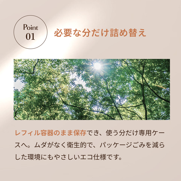 レフィル容器のまま保存でき、使う分だけ専用ケースへ。