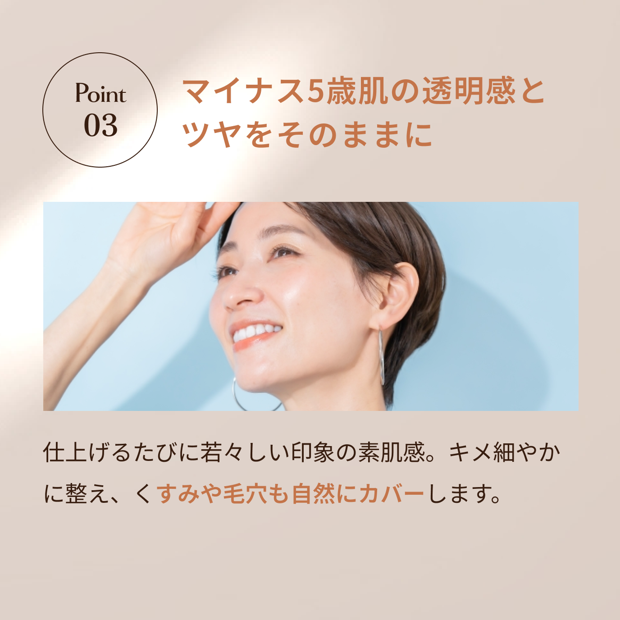 仕上げるたびに若々しい印象の素肌感。