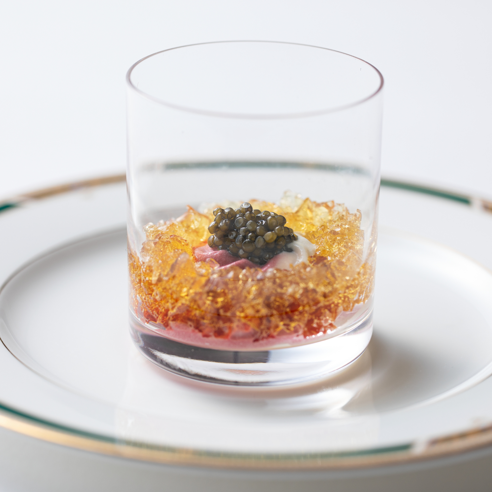 赤ビーツのムース、玉ねぎのピュレとコンソメのジュレの三重奏